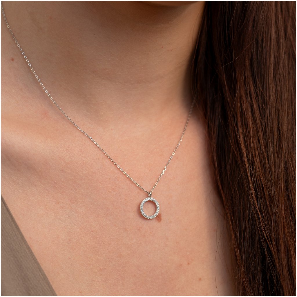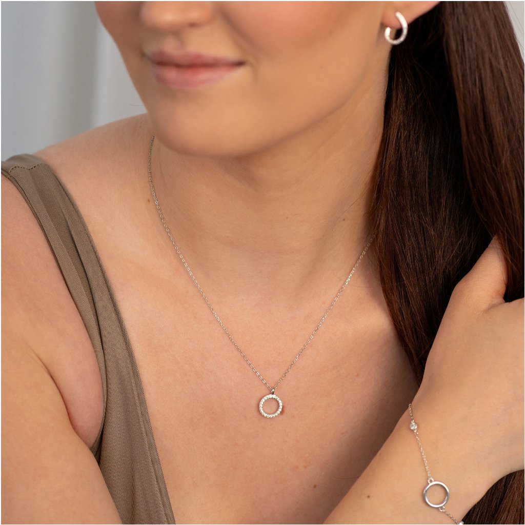 Colier minimalist argintiu cu un pandantiv circular prelucrat cu precizie, care este decorat cu o serie de zirconii clare strălucitoare. Designul lucios și forma curată simbolizează eleganța, echilibrul și atemporalitatea – un accesoriu ideal pentru fiecare zi, dar și pentru ocazii festive.