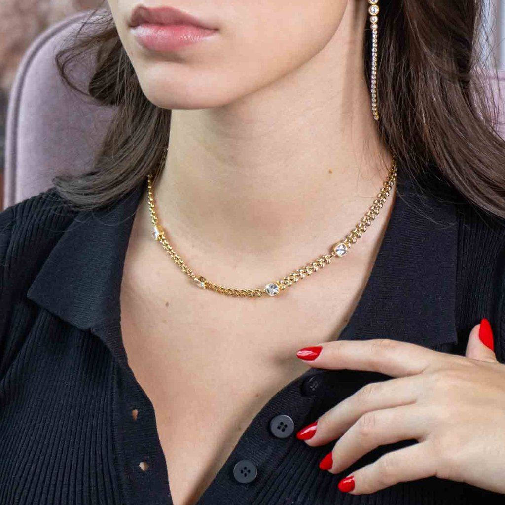 Un lanț discret, decorat cu frunze mici și zirconii transparente așezate regulat, va atrage prin detaliile sale elaborate și prin lejeritate. Un motiv vegetal fin, în combinație cu strălucirea zirconiilor, creează un întreg armonios, care va completa frumos ținuta de zi cu zi, dar și un stil mai festiv. Datorită lanțului de prelungire, lungimea poate fi ajustată cu ușurință și lanțul poate fi purtat singur sau stratificat cu alte bijuterii.