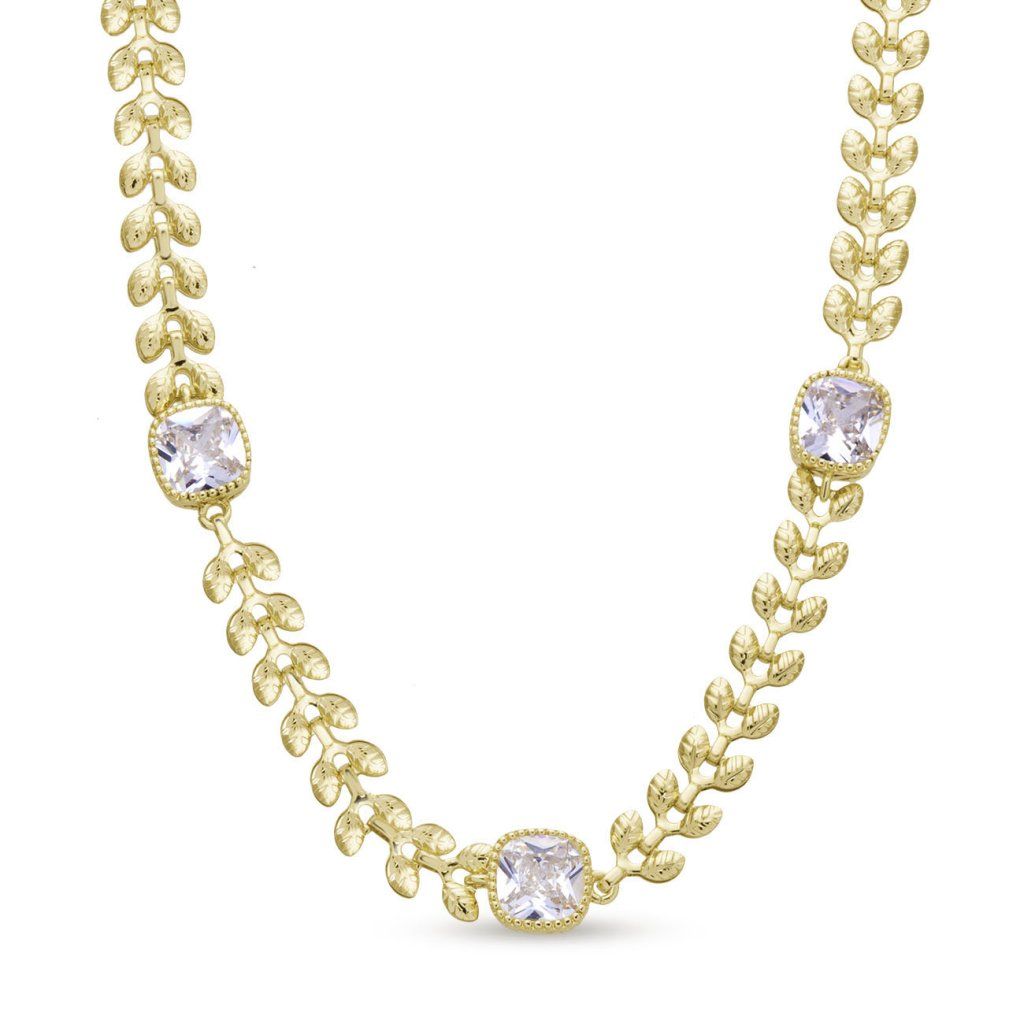 Un lanț fin placat cu aur, cu un motiv decorativ de frunze și zirconii transparente, arată elegant și romantic.