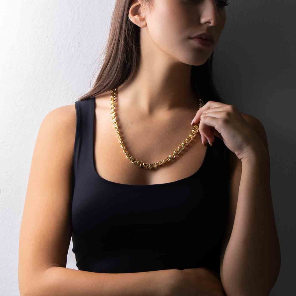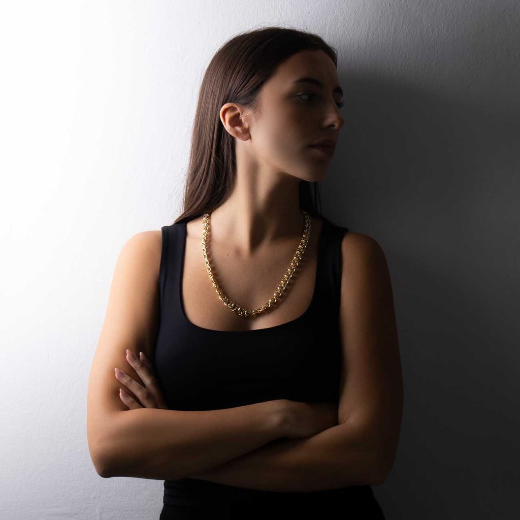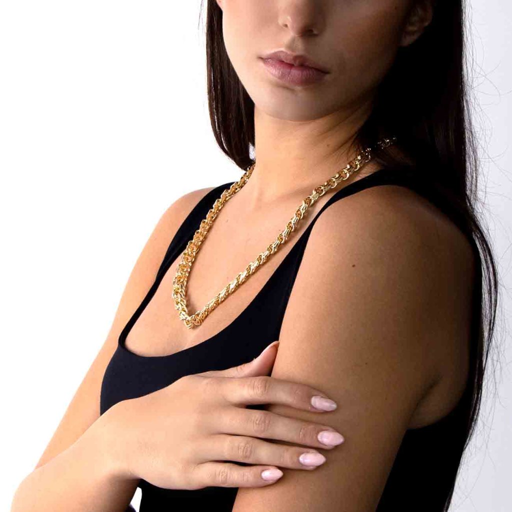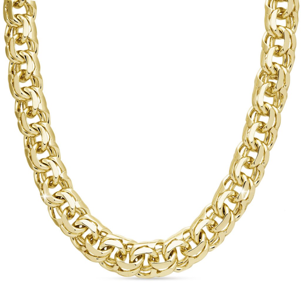Acest lanț masiv cu aspect luxos, cu zale împletite rotund, este un accesoriu de modă izbitor, care atrage atenția de la prima vedere. Măiestria sa precisă și structura bogată creează o impresie elegantă și îndrăzneață în același timp. Finisajul cu aur de 14 karate asigură un aspect strălucitor și luxos, în timp ce rodierea contribuie la o durată de viață mai lungă și la protecție împotriva uzurii.