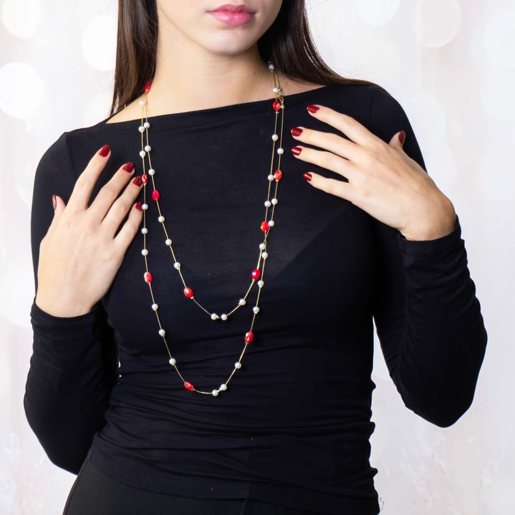 Delicat, dar captivant, colier lung într-o combinație de lanț auriu, perle albe lucioase și pietre fațetate fuchsia izbitoare. Aspectul romantic, cu o notă subtilă de eleganță, îl face un accesoriu ideal pentru rochii, bluze și topuri simple.