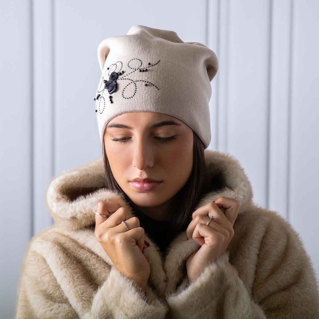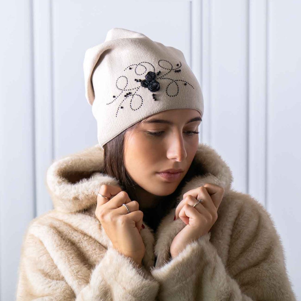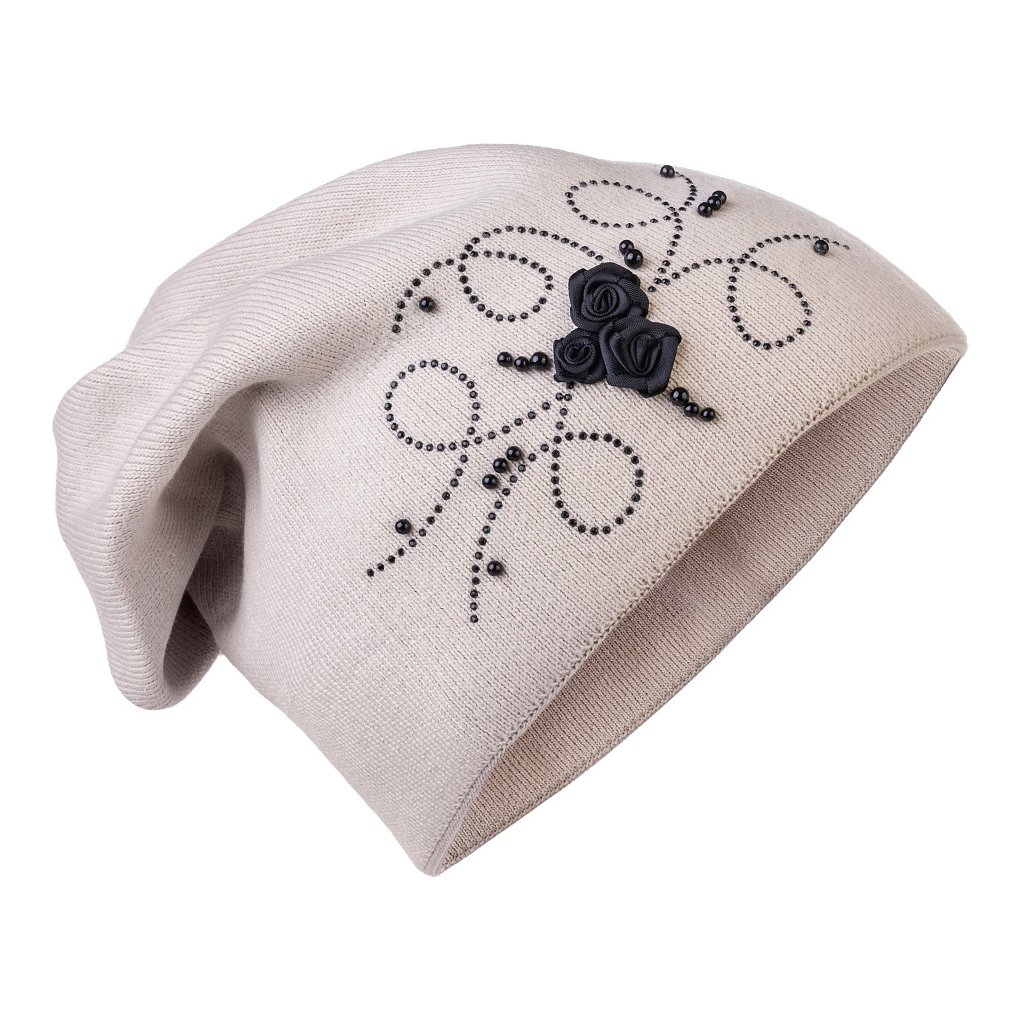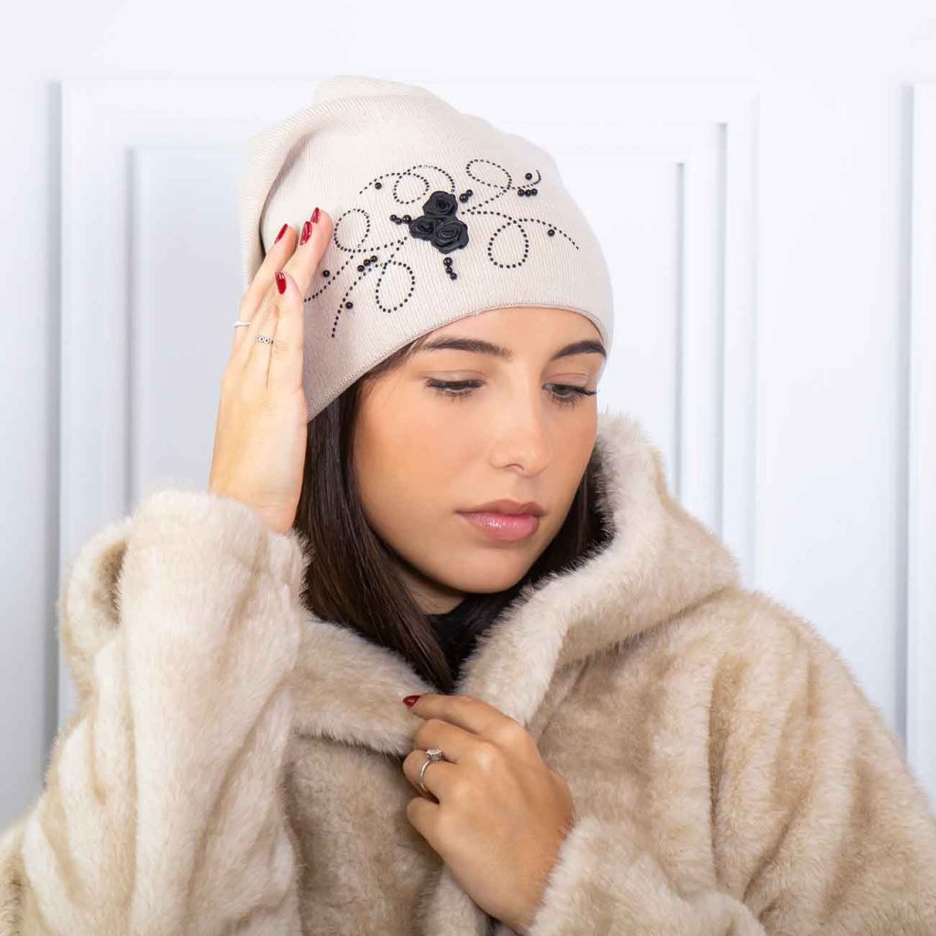 Pălărie tricotată pentru femei cu trandafiri și pietre prețioase, bej 7100374-1
