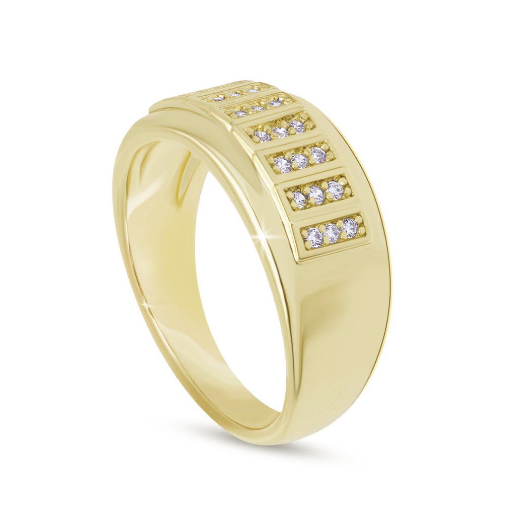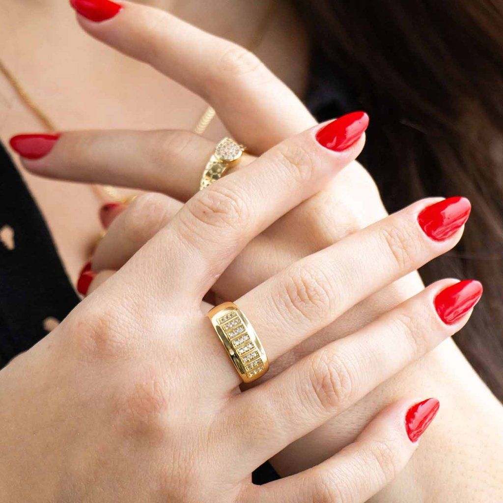 Un inel modern și distinctiv, cu o montură geometrică de zirconii, va oferi mâinii tale o expresie puternică și elegantă. Corpul strălucitor din aur al inelului este completat de benzi delicate sclipitoare, care creează o textură interesantă și un joc de lumini.