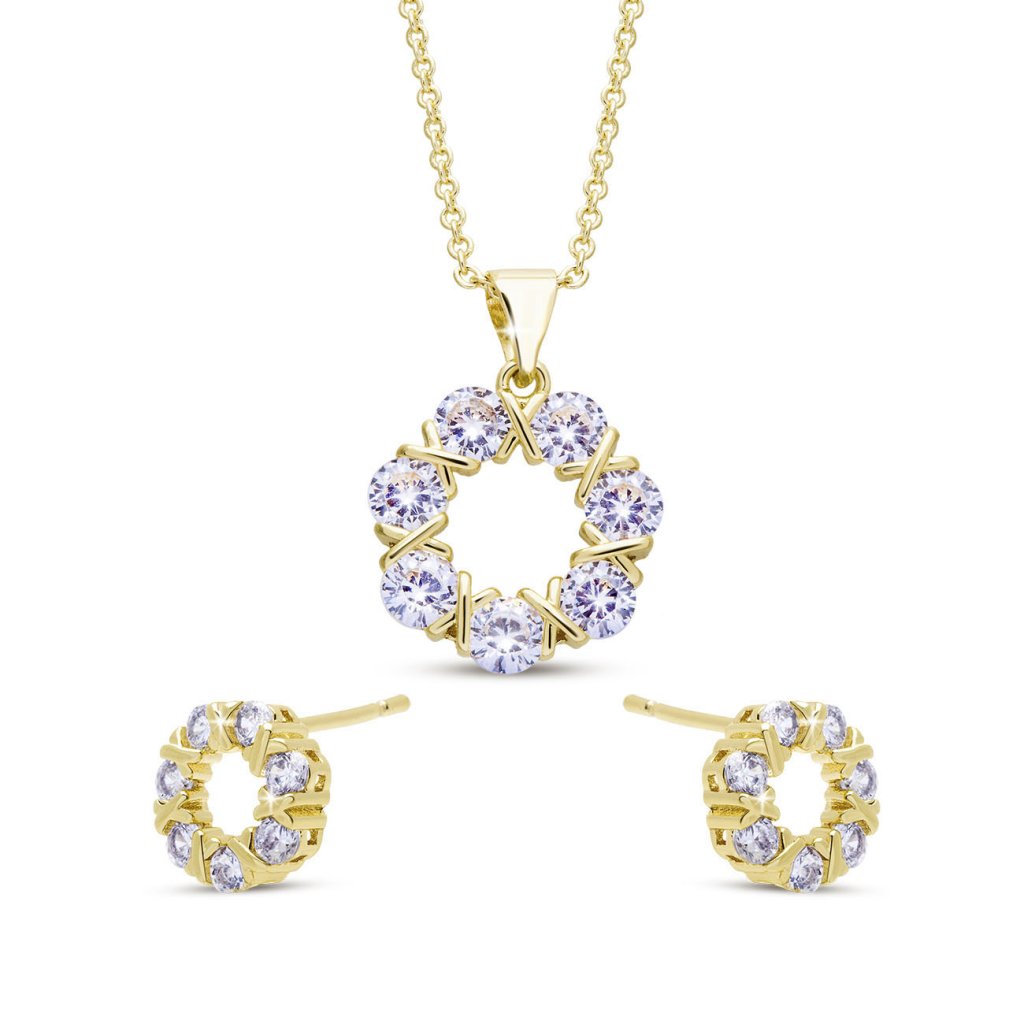Eleganță atemporală într-o interpretare modernă – setul cu cercei și colier impresionează prin aranjamentul rafinat al zirconiilor clare într-un cerc armonios. Fixarea aurie precisă conferă bijuteriei o notă de lux, în timp ce pietrele strălucitoare îți subliniază feminitatea. O alegere ideală pentru purtarea de zi cu zi și ocazii festive.