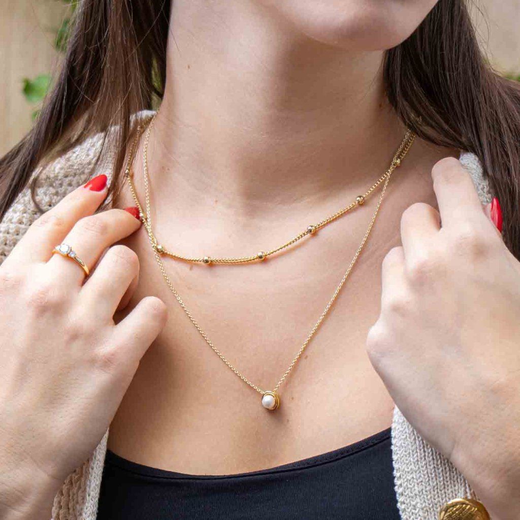 Colier fin și elegant cu un pandantiv central în formă de perlă încastrată într-un oval auriu, ce emană armonie și rafinament. Designul minimalist pune în valoare frumusețea naturală a perlei, în timp ce strălucirea subtilă a metalului placat cu aur adaugă un plus de eleganță întregului ansamblu. Accesoriul ideal pentru purtarea de zi cu zi, dar și pentru ocazii festive.