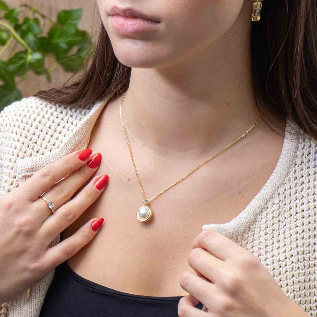 Bijuterie delicată și totuși fermecătoare, care combină frumusețea clasică a perlei cu strălucirea zirconiilor. Trei zirconii în formă de picătură formează o coroană discretă deasupra pandantivului rotund cu perlă, care este încastrat într-un cadru neted, auriu. Un accesoriu perfect pentru ocazii festive, dar și pentru eleganța de zi cu zi.