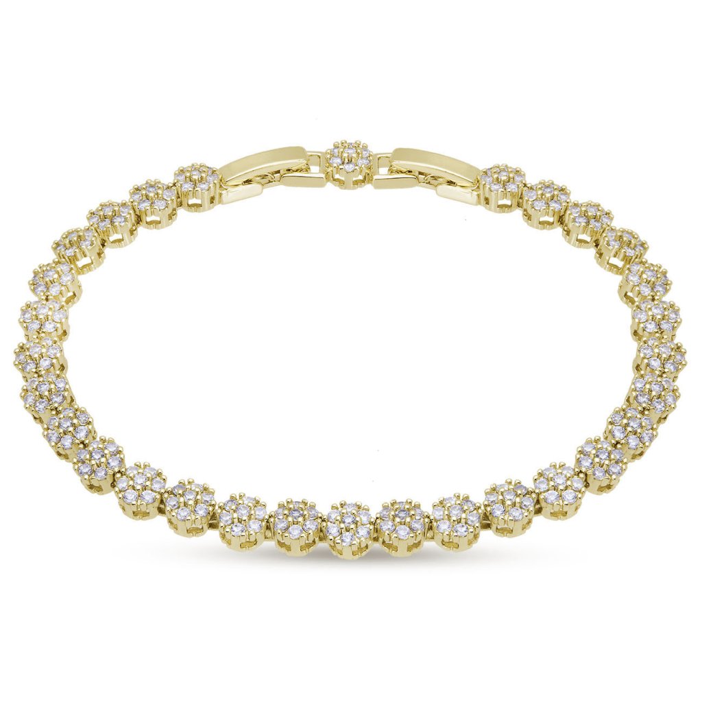 Această brățară distinctivă, placată cu aur, atrage atenția prin compoziția rafinată de flori strălucitoare, incrustate cu zirconi fini. Fiecare detaliu pare precis și gustos – ansamblul creează o bijuterie armonioasă, care adaugă o scânteie unei ținute festive și eleganță unei zile obișnuite. Ideală pentru femeile care doresc să strălucească.