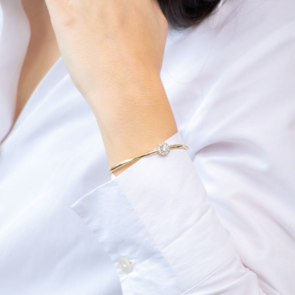 Minimalist, dar de nelipsit – această brățară solidă cu un motiv central rotund, împodobit cu zirconiu, pare delicată și festivă în același timp. O alegere excelentă pentru ținuta de zi cu zi, dar și pentru ocaziile de seară.