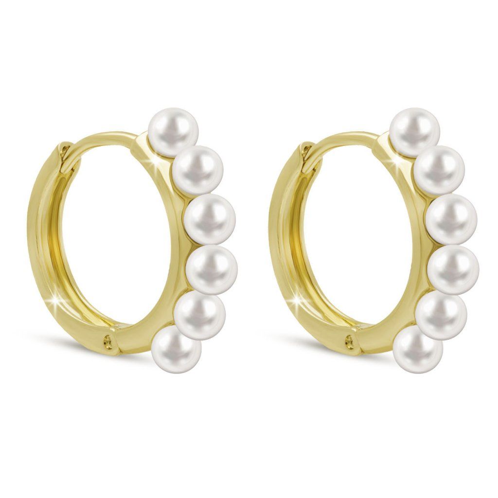 Cercei rotunzi atemporali cu o serie de perle delicate, care creează un arc elegant într-un finisaj auriu strălucitor. Manopera precisă și compoziția simetrică par echilibrate, făcând bijuteria potrivită atât pentru purtarea zilnică, cât și pentru ocazii festive. Închiderea cu balama asigură o potrivire confortabilă și o fixare sigură.