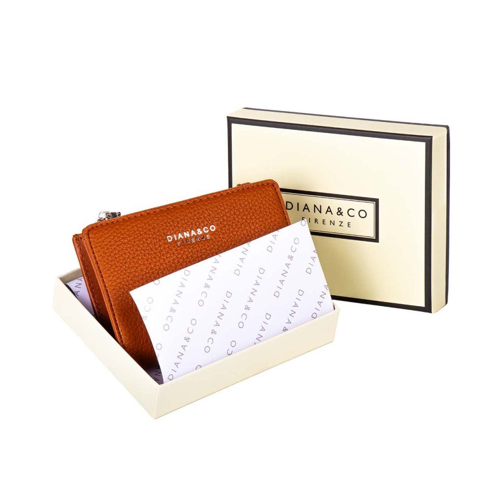 În interior, oferă suficient spațiu pentru carduri de plată, documente și bancnote, plus un buzunar practic cu fermoar pentru monede. Logo-ul metalic Diana & Co Firenze de pe partea frontală are un aspect elegant și subliniază șarmul italian al brandului.