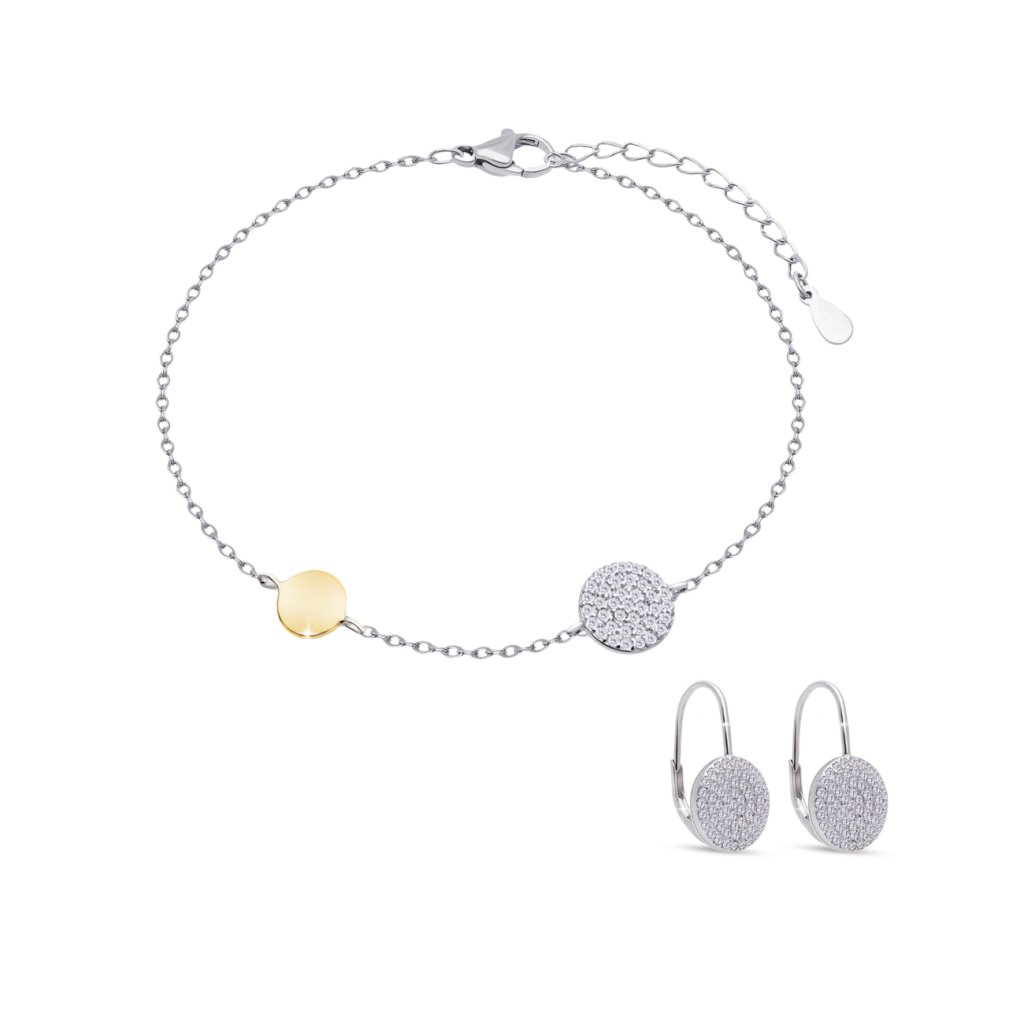 Un set modern din argint fin, care impresionează prin contrast și eleganță discretă. Brățara este decorată cu două inele – unul neted, placat cu aur de 14K, și celălalt încrustat cu zirconii strălucitoare. Cerceii asortați, în formă de discuri circulare, strălucesc datorită tehnicii precise de montare pavé și au un aspect elegant și de impact în același timp. O alegere excelentă pentru femeile care caută un accesoriu stilat, dar discret, pentru a fi purtat zilnic sau la ocazii speciale.