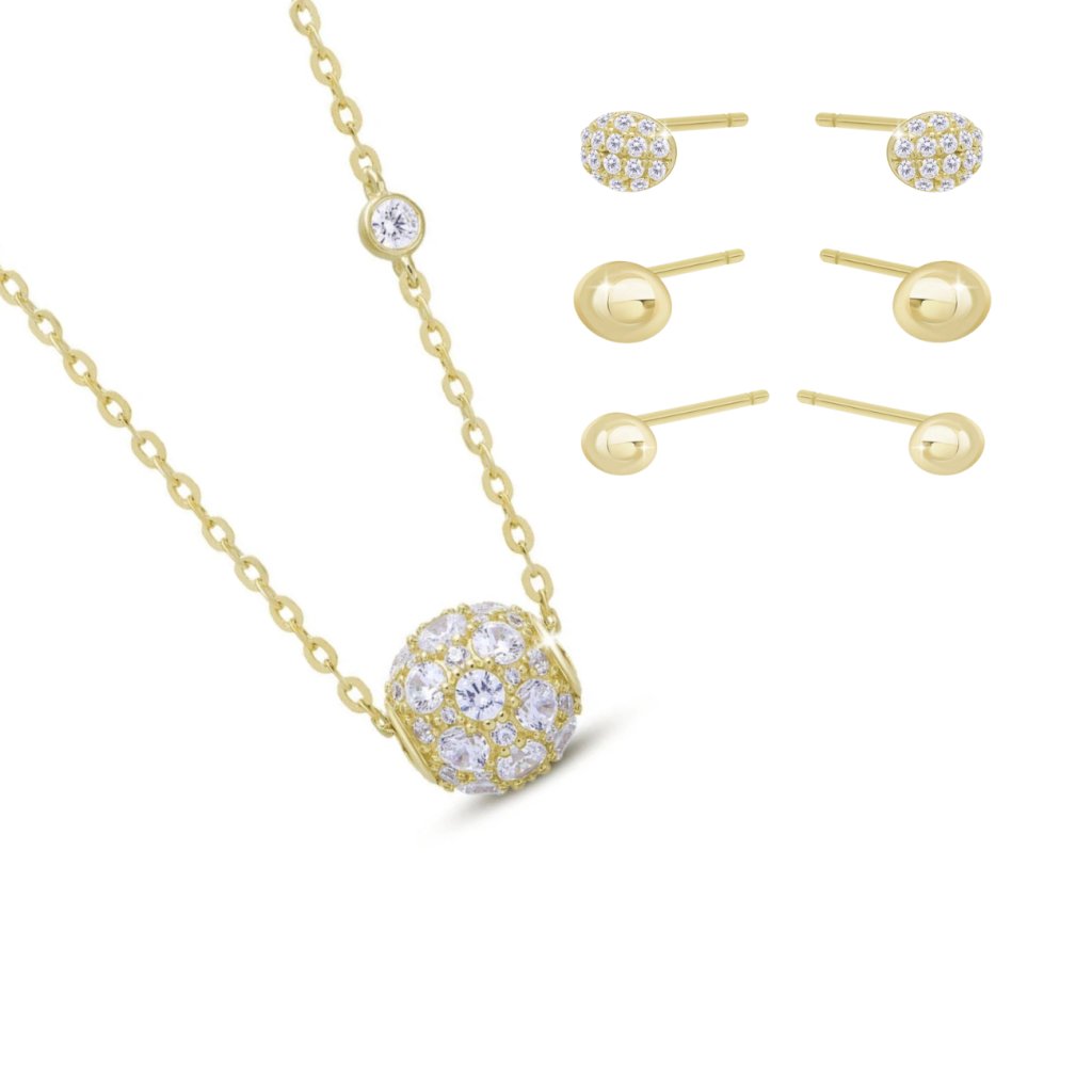 Un set atemporal care combină delicatețea și strălucirea. Colierul cu un pandantiv strălucitor, incrustat cu zirconiu, se potrivește perfect cu trei perechi diferite de cercei stud. Datorită finisajului discret și a placării cu aur de 14K, setul este o bijuterie ideală pentru fiecare zi și pentru ocazii festive. Fiecare detaliu este prelucrat cu precizie pentru a vă oferi o strălucire de eleganță.