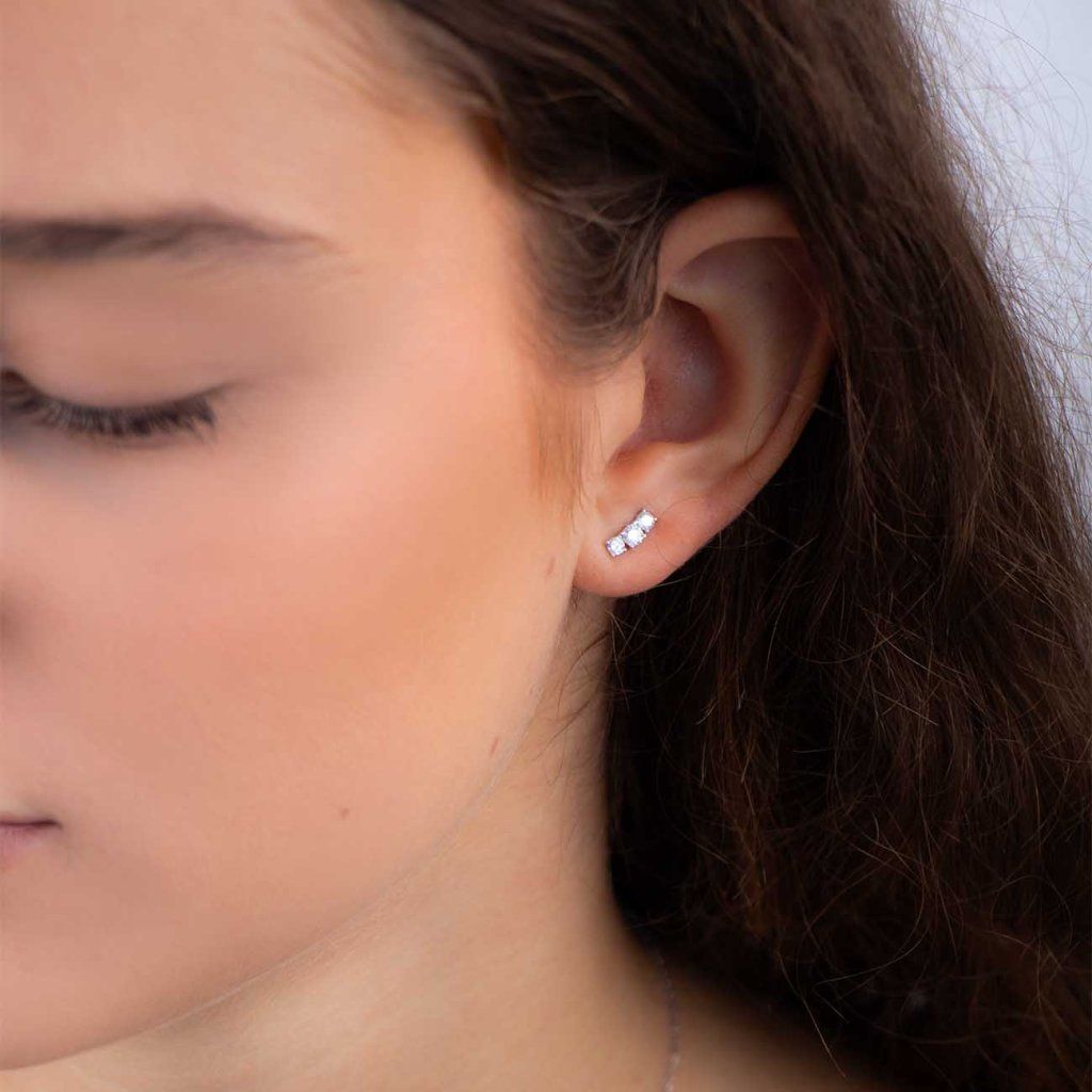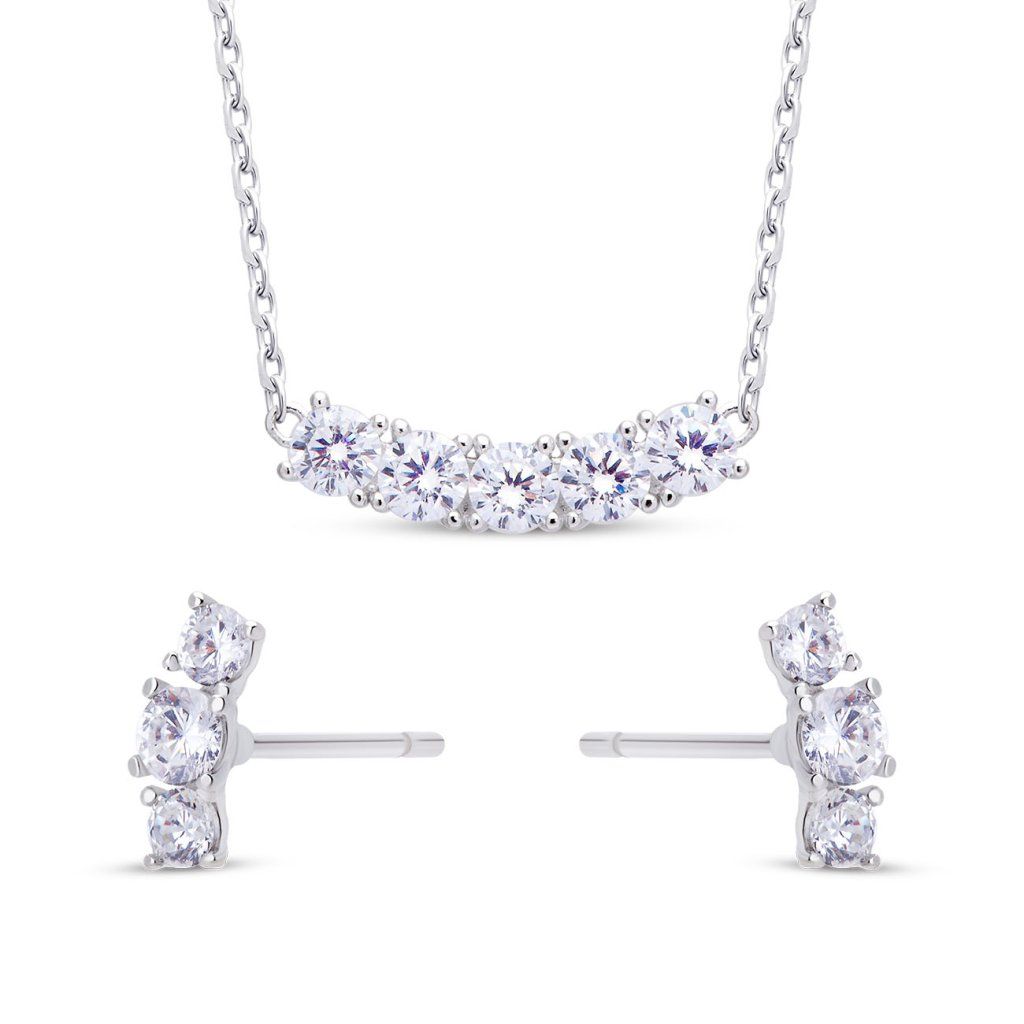 Acest set delicat din argint Ag 925/1000 impresionează prin designul său elegant curbat, decorat cu zirconii clare. Colierul formează un arc strălucitor, care urmărește frumos linia gâtului, în timp ce cerceii cu un trio de pietre continuă aspectul curat și armonios. O alegere excelentă pentru momente festive și eleganță de zi cu zi.