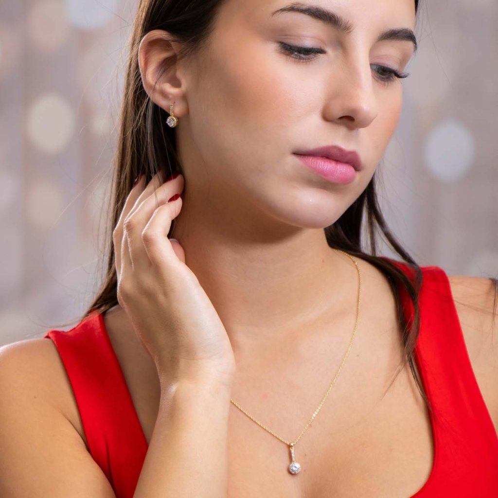 Set placat cu aur de 14k - lanț cu pandantiv + cercei. Setul este realizat din metal placat cu rodiu completat cu zirconii fine și lustruit la perfecțiunea absolută. Acest set este o alegere excelentă nu doar pentru ocazii festive, ci completează de minune și o rochie simplă ori topul dumneavoastră preferat. Datorită delicateții acestui set, setul arată foarte elegant.