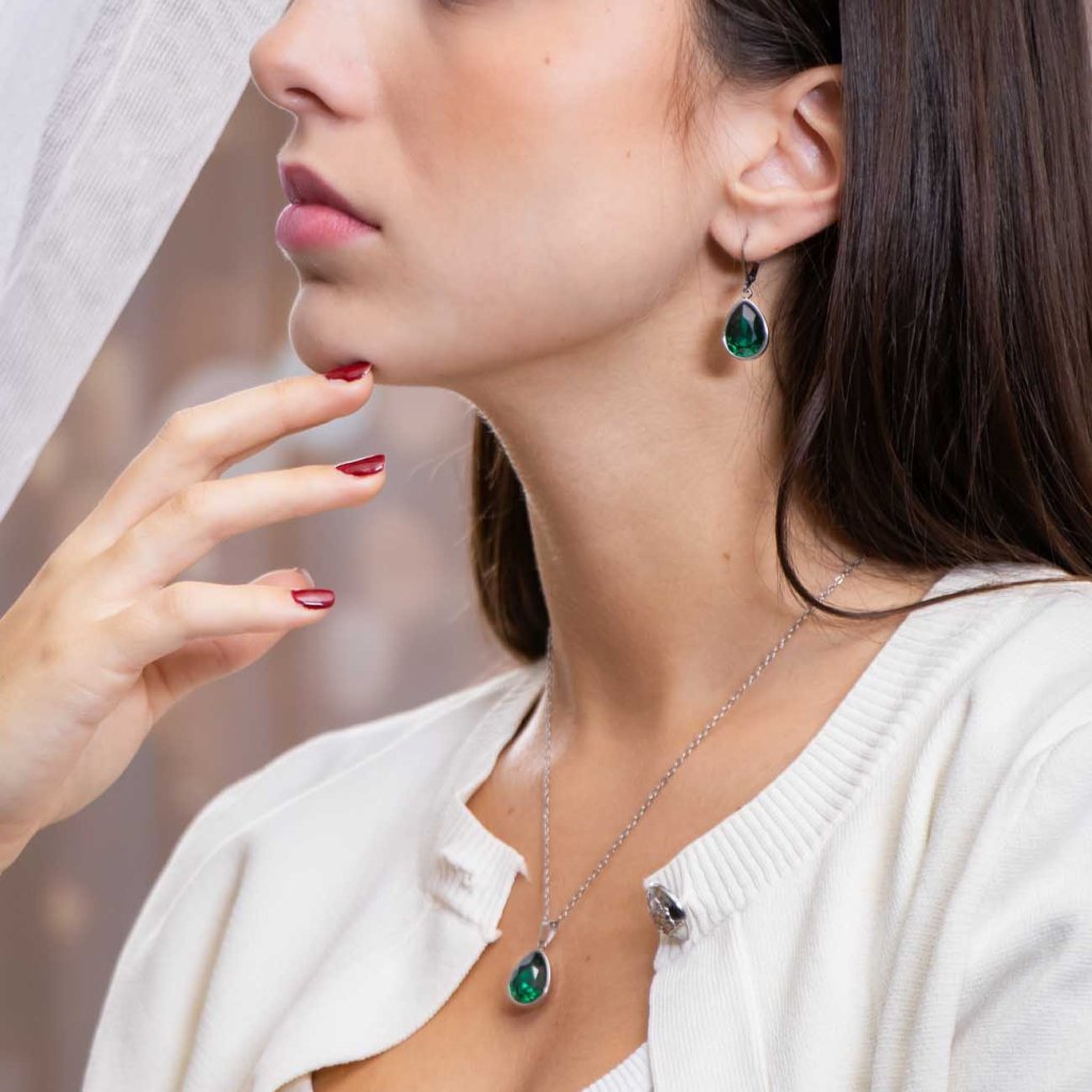 Set picături din oțel chirurgical, lanț + cercei cu zircon smarald 100002