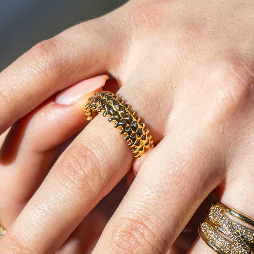 Purtați-l ca un inel dominant, de sine stătător, sau combinați-l cu inele mai delicate pentru un efect modern stratificat. Pentru a menține strălucirea, evitați contactul cu apa și parfumul. Pentru a menține luciul, evitați contactul cu apa și parfumul.
