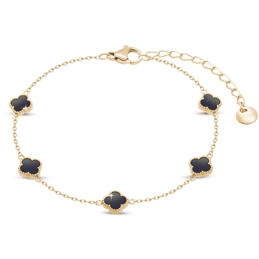 Brățara elegantă cu cinci trifoi cu patru foi, cu un centru negru lucios, se remarcă prin lanțul fin și luciul placat cu aur. Simbolul norocului într-un design gustos conferă bijuteriei o notă distinctivă, potrivită atât pentru ținutele de zi cu zi, cât și pentru ocazii festive. Extensia asigură o potrivire ideală pe încheietura mâinii.