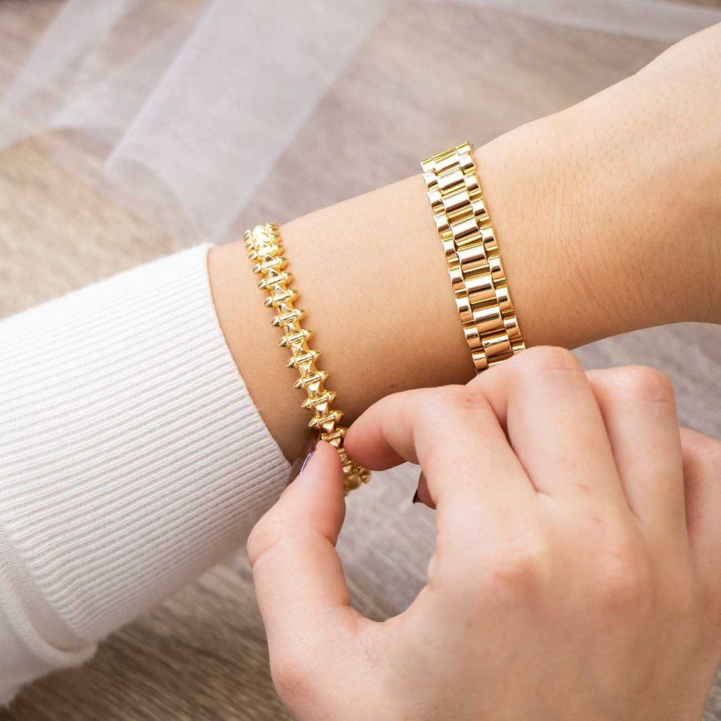 Brățara solidă cu elemente de vârf dispuse regulat are un aspect încrezător, elegant și, în același timp, foarte grațios. Manopera precisă și suprafața lucioasă netedă creează o bijuterie distinctă care va deveni punctul central al oricărui outfit. Aurirea cu aur de 14K conferă brățării un caracter luxos și un aspect atemporal, făcând-o alegerea ideală pentru un stil modern, distinctiv, dar și pentru ocazii festive.