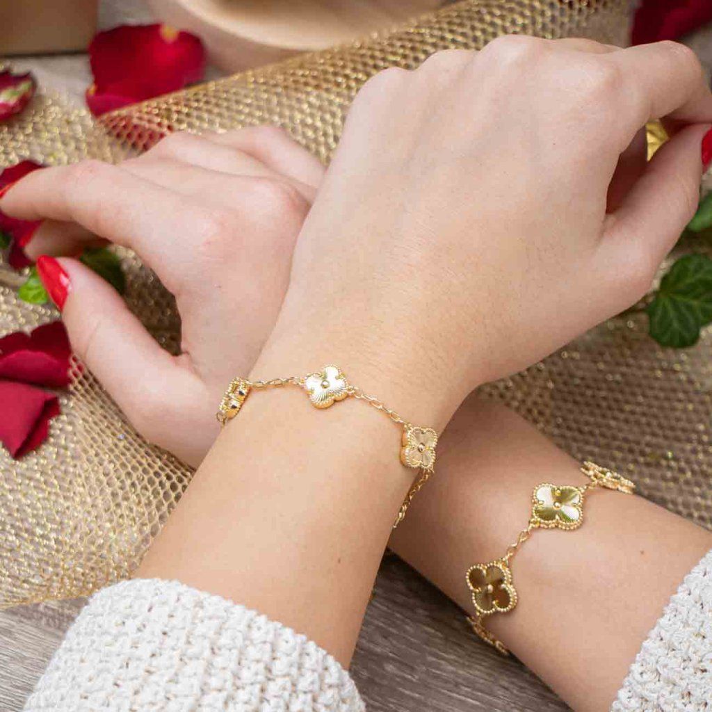 Brățara stilată impresionează prin florile dominante cu suprafață fin gravată, creând un ansamblu distinct, dar elegant. Liniile curate și prelucrarea precisă subliniază aspectul sofisticat al bijuteriei, în timp ce placarea cu aur de 14K îi conferă o strălucire luxoasă. Datorită lanțului prelungitor, se ajustează confortabil pe încheietură și devine un accesoriu de neignorat pentru orice ținută, de zi cu zi sau festivă.