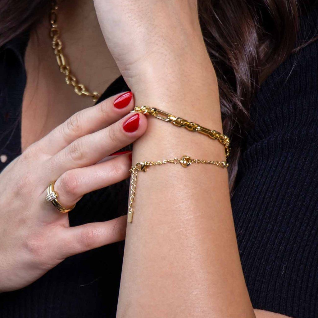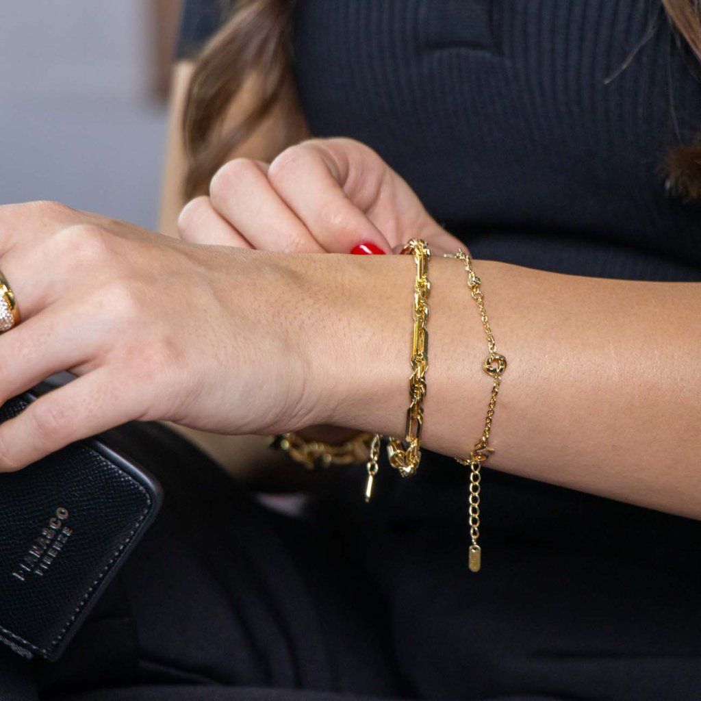 Metal rodiat, placat cu aur de 14K – Bijuteria este fabricată din metal rezistent cu un strat de rodiu și aur de 14 karate, care îi conferă un luciu ridicat, o protejează împotriva zgârieturilor și asigură o durată lungă de viață fără înnegrire. Datorită proprietăților hipoalergenice, este potrivit și pentru pielea sensibilă. Nu conține nichel.