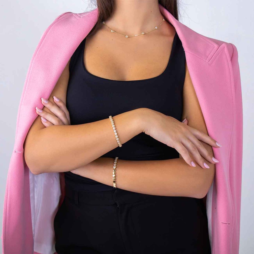 O brățară elegantă formată dintr-o serie de inimioare delicate, dintre care jumătate sunt netede și lucioase, iar cealaltă jumătate este împânzită cu zirconii fine. Combinația armonioasă de luciu și strălucire creează o bijuterie atemporală, care arată delicat, romantic și, în același timp, luxos. Ideală ca un cadou din dragoste sau ca un accesoriu discret pentru purtarea de zi cu zi.