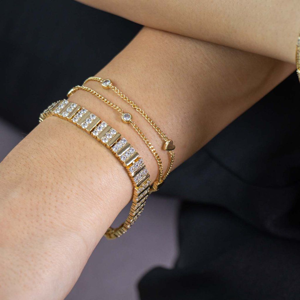 O brățară fină, dublă, cu inimioare mici și discuri strălucitoare de zirconiu, se remarcă prin lejeritatea și farmecul său feminin. Designul elegant este potrivit pentru a fi purtat în straturi sau ca un accesoriu individual, care decorează discret încheietura mâinii și adaugă un accent romantic ținutei.