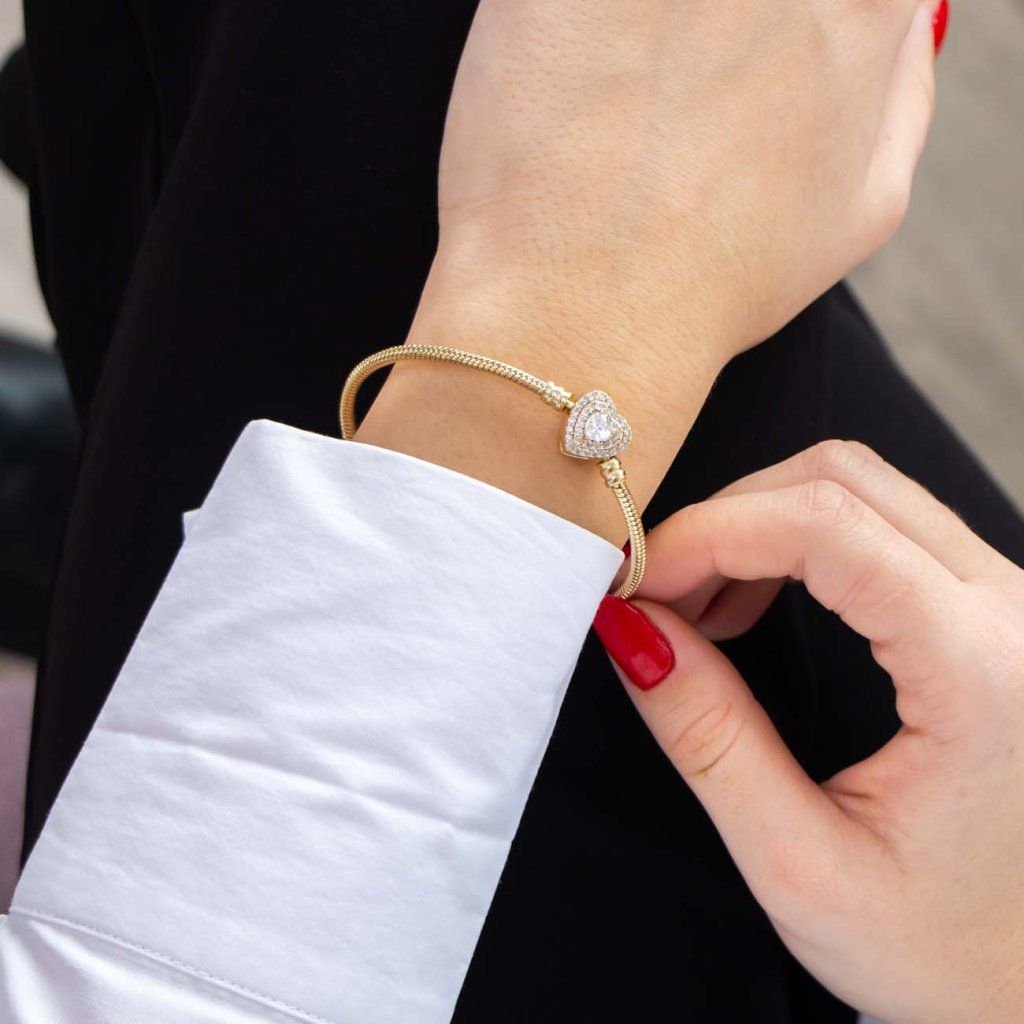 Brățară elegantă cu lănțișor șarpe flexibil, împodobită cu o inimă proeminentă, bogat ornamentată cu zirconii transparente. Motivul strălucitor conferă bijuteriei o notă de lux, în timp ce inima simbolizează dragostea și blândețea – un cadou ideal pentru momente speciale sau ca un accesoriu elegant pentru ținuta de zi cu zi.