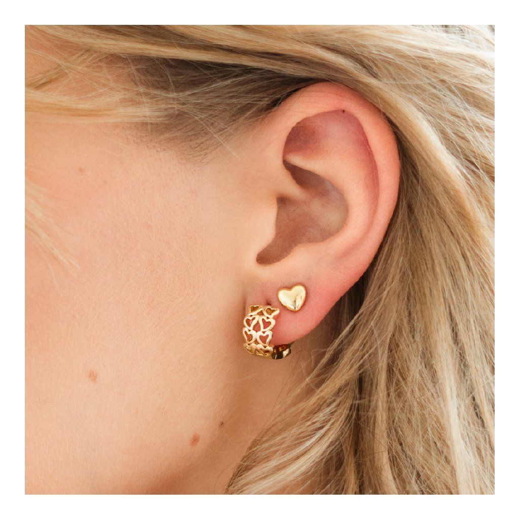 Cercei placați cu aur de 14k. Inele decente cu motiv împletit delicat, compus din inimi. Acești cercei vor completa orice ținută fără a copleși alte accesorii de modă.